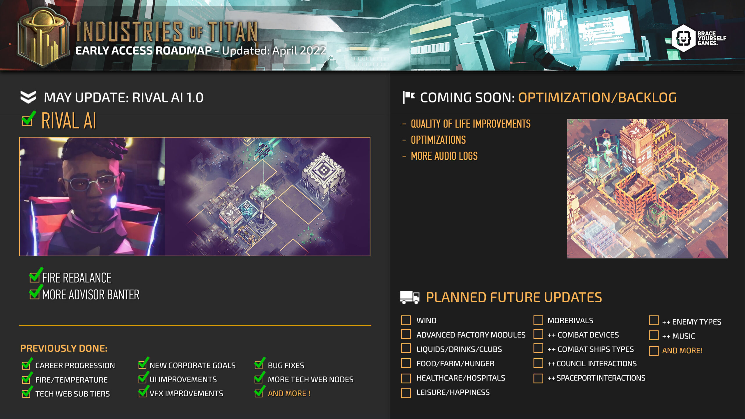 Industries of Titan is in Early Access, which means we are actively updating and adding new content based on our roadmap and your wonderful feedback. You can expect the next Titan Tuesday on June 7th.